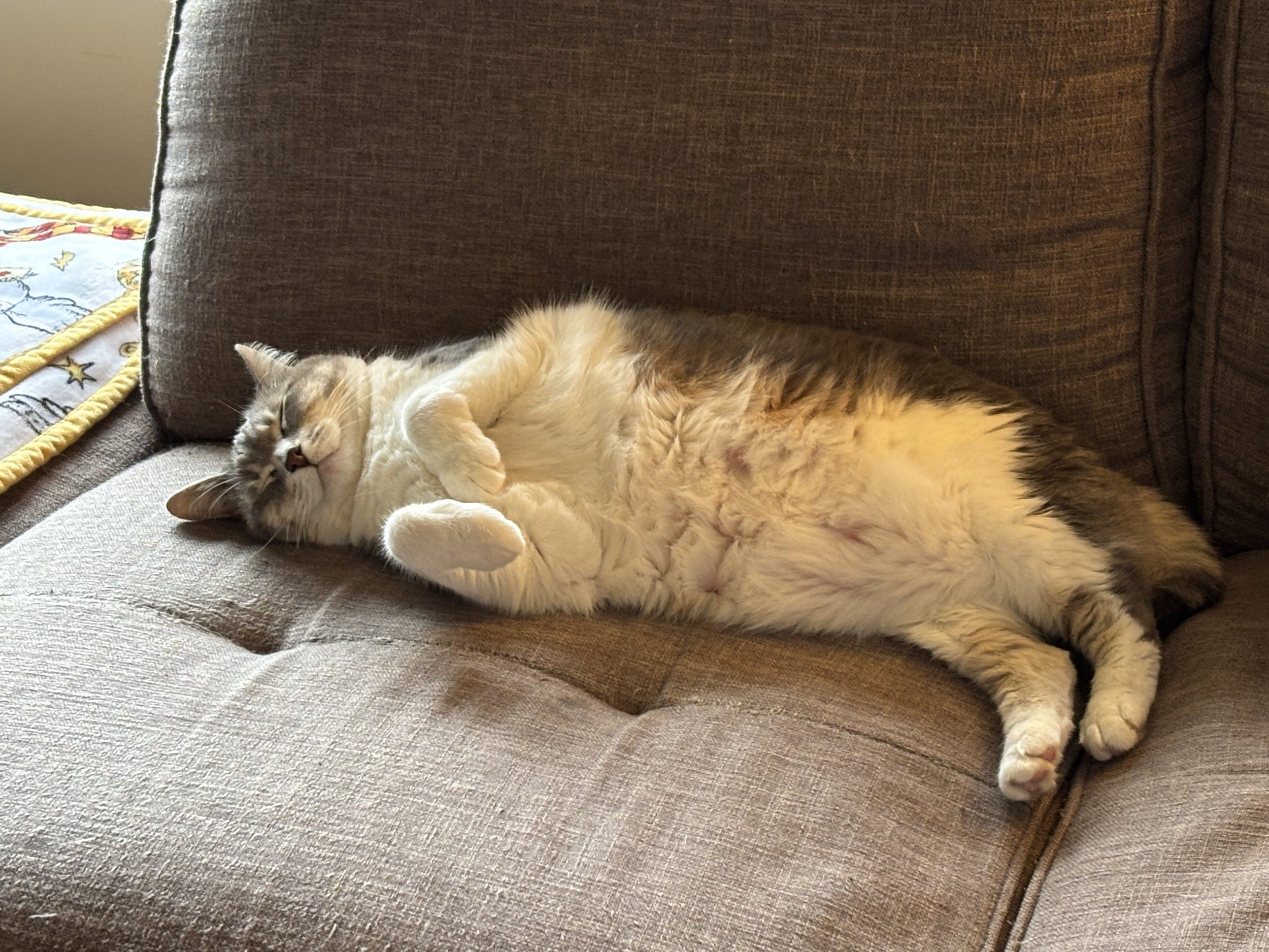 As the years went by, June got more and more comfortable at the apartment, but she would still wince when I tried to pet her, and she’d sleep on the couch for hours, only to get up and leave if I stood up from a chair or came into the living room. It was progress, but she was clearly still struggling.