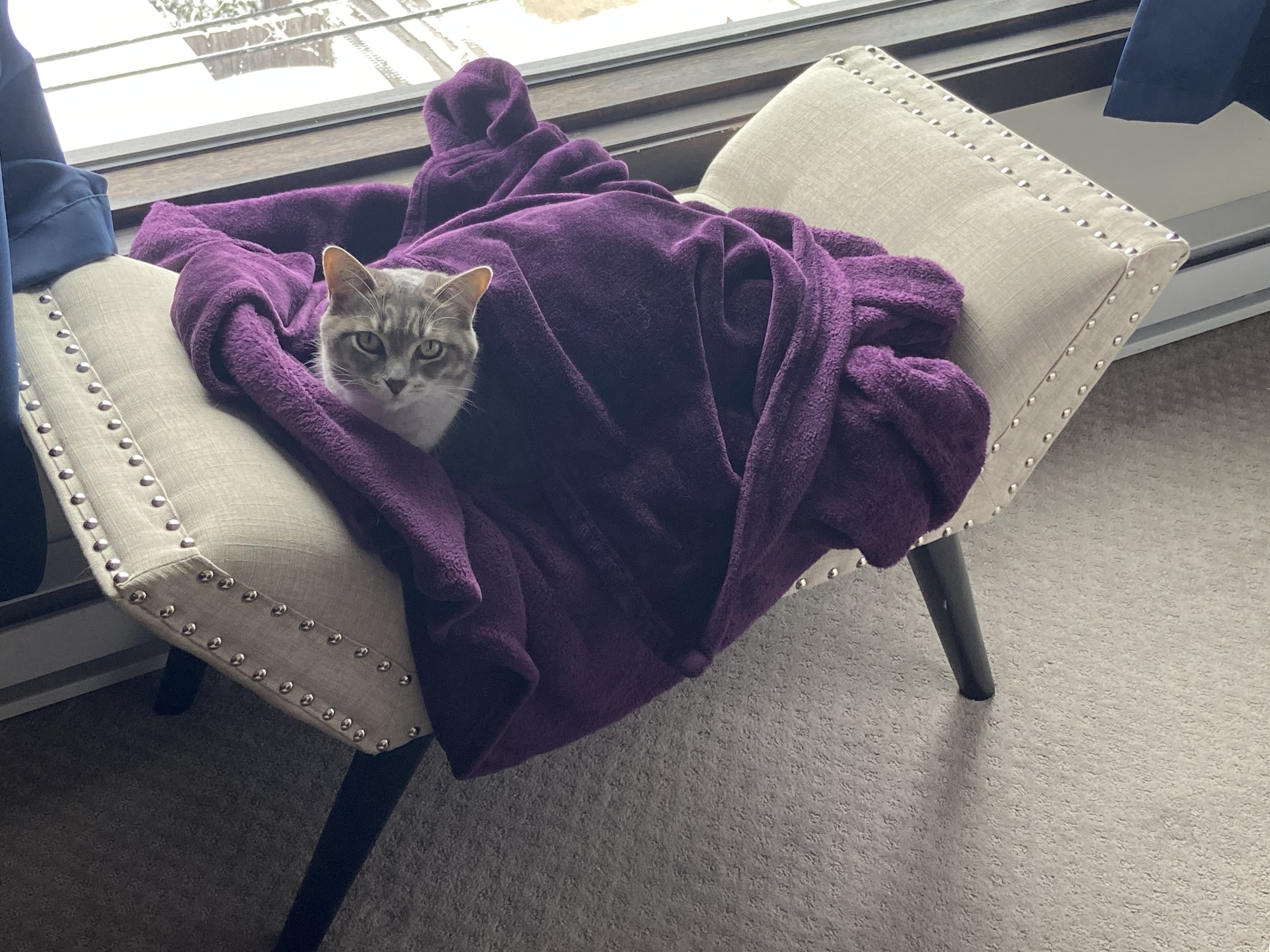 Once out in the main apartment, June took to the bottom of my cat tree. Since I noticed her setting up shop in there, I decided to make it more comfortable for her. I put a fleecy blanket in there and lots of padding under and around it. Using a towel, I blocked off the top opening and sides, so she could have some privacy, and she definitely needed it.